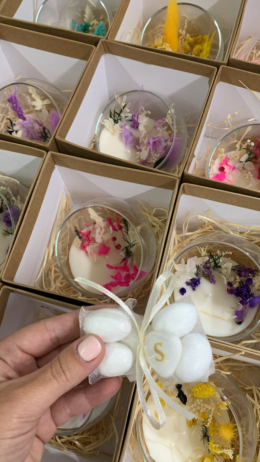 Candela in cera di soia finemente confezionata rustica con fiori secchi