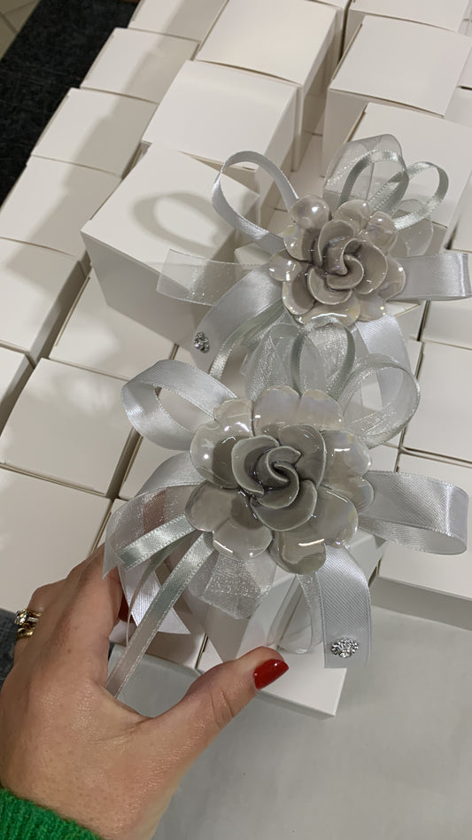 Fiore grigio madreperla confezionato su scatola portaconfetti