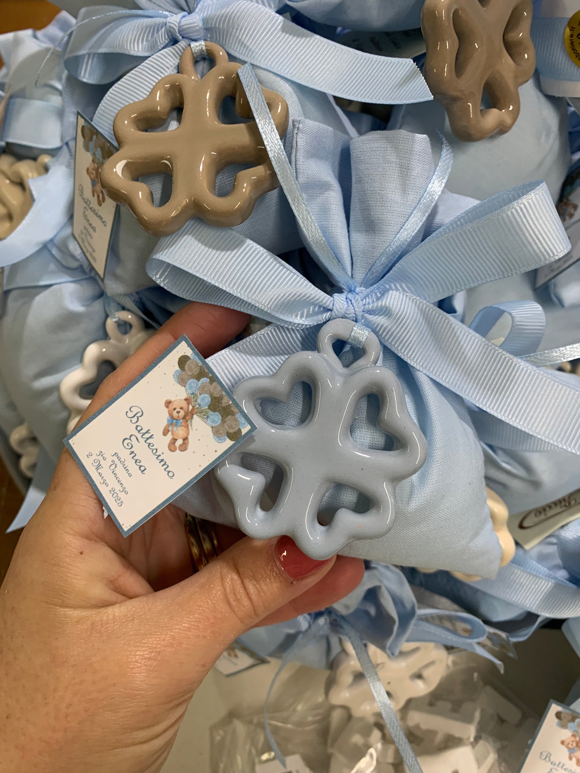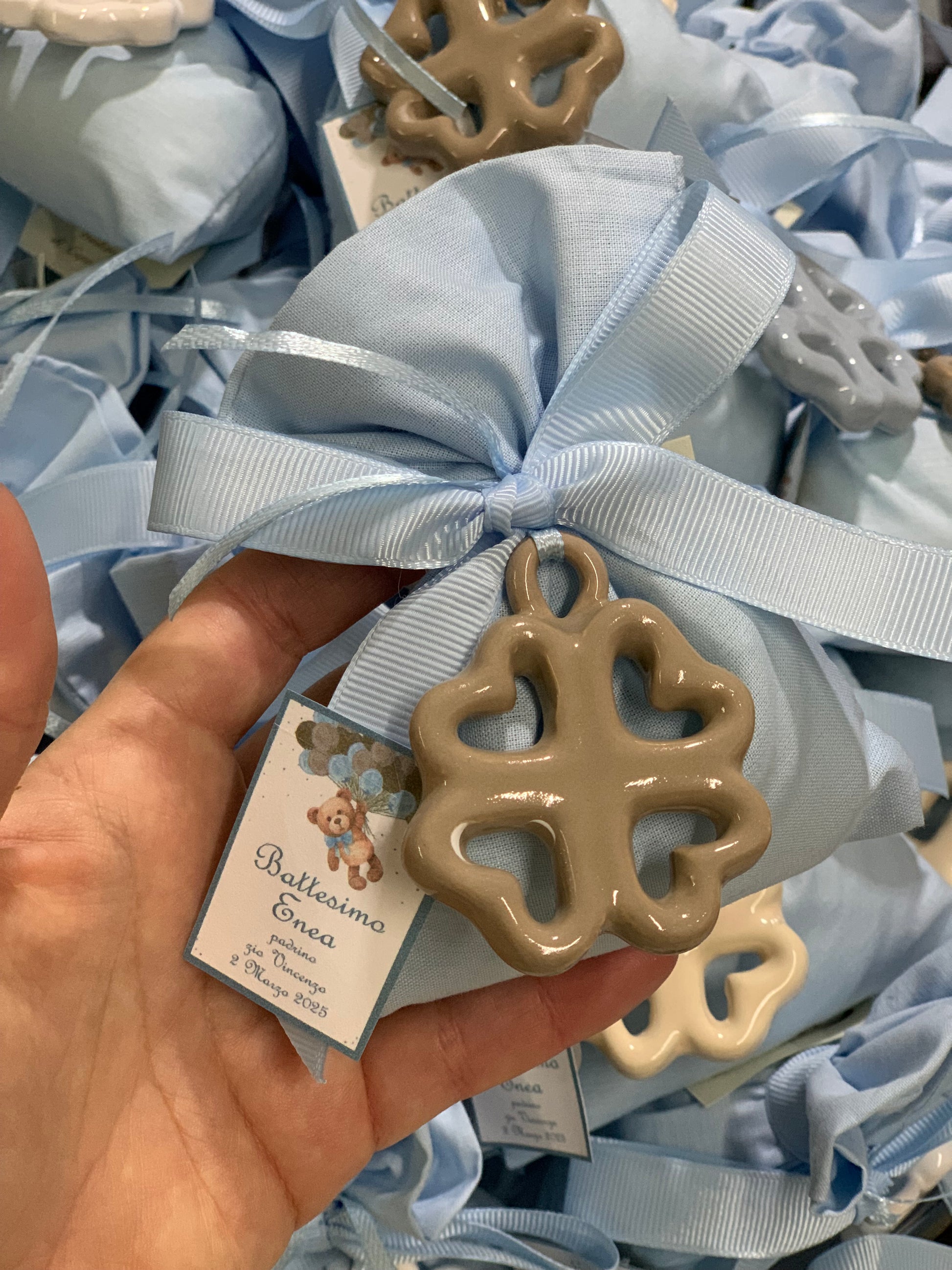 quadrifoglio in ceramica di Capodimonte 5cm confezionato su sacchetto completo di nastri confetti e bigliettino personalizzato